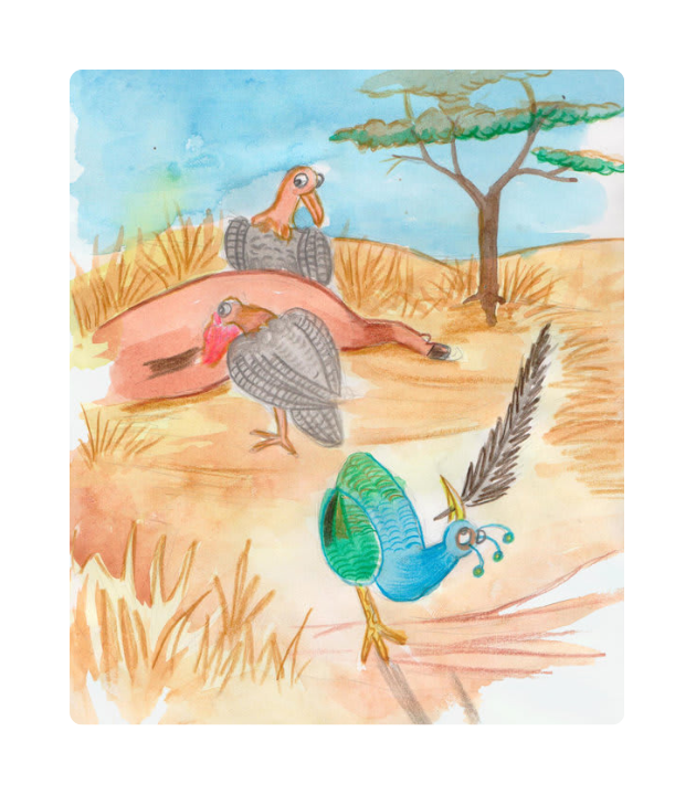 ក្ងោក ថាស៊ី និយាយជាមួយខ្លួនវាថា៖ បើខ្ញុំជាបក្សីមែនខ្ញុំគួរតែអាចហើរបាន។តែហេតុអ្វីបានជាខ្ញុំមិនមានស្លាបដូចបក្សីដទៃ?